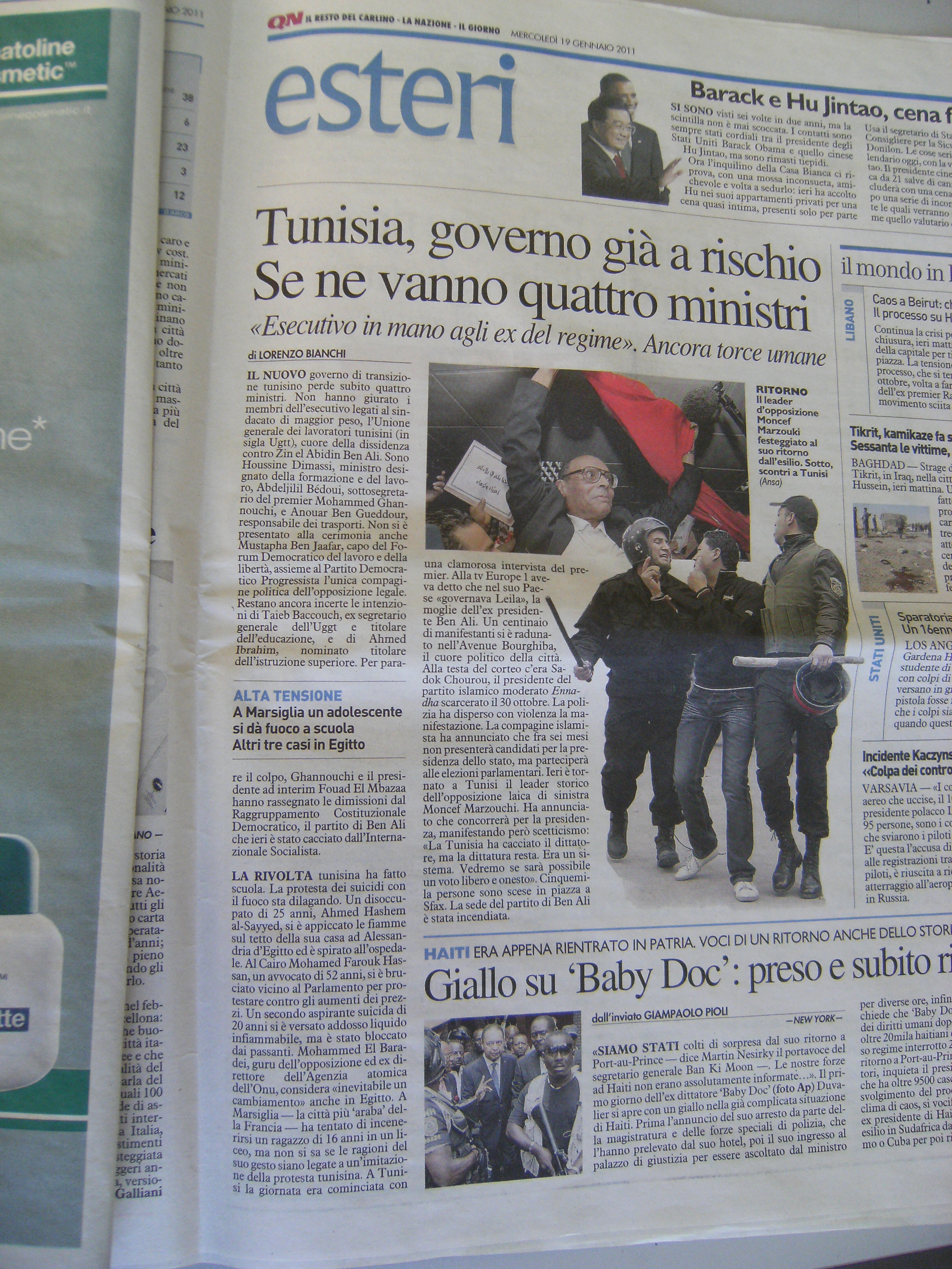 Agli ex del regime i ministeri-chiave. Tunisia ancora in piazza di Lorenzo Bianchi in Il Giorno del 18 gennaio 2011 pp. 10, 11
