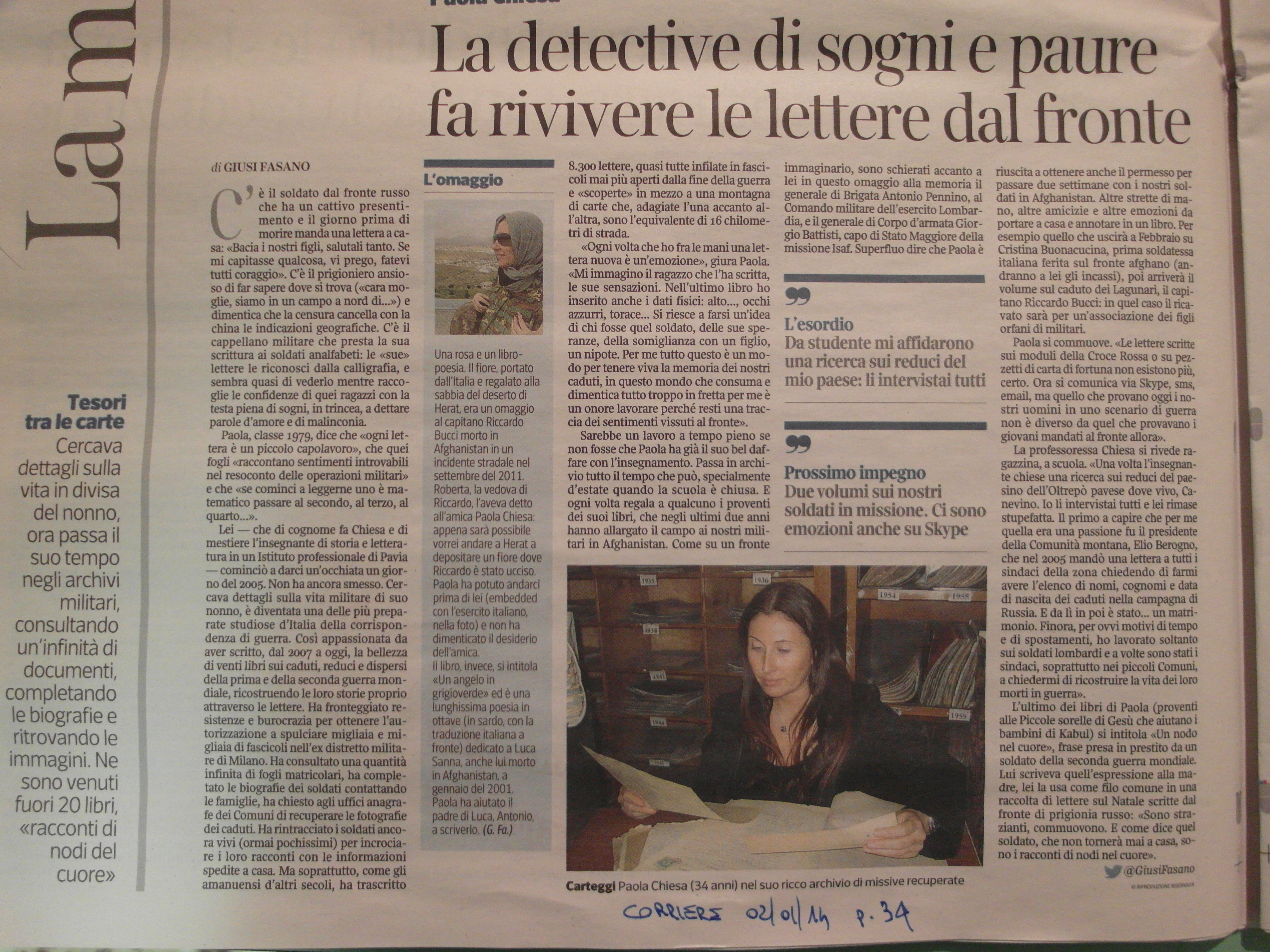 La detective di sogni e paura fa rivivere le lettere dal fronte di Giusi Fasano su Corriere della Sera del 2 gennaio 2014 p. 34