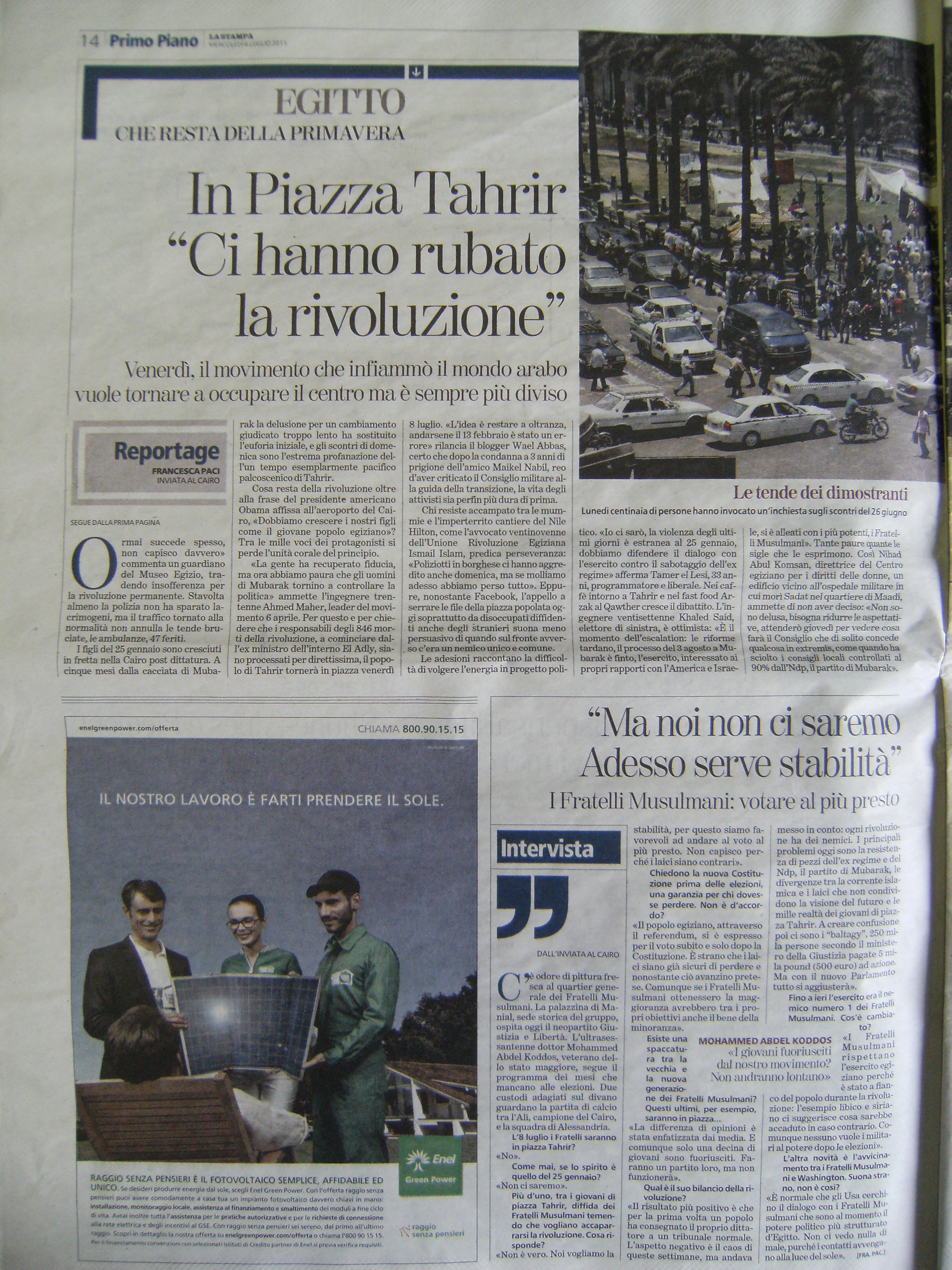 Piazza Taharir quel che resta della rivoluzione prima pagina de La Stampa del 6 luglio 2011, pagina 14, pagina 15
