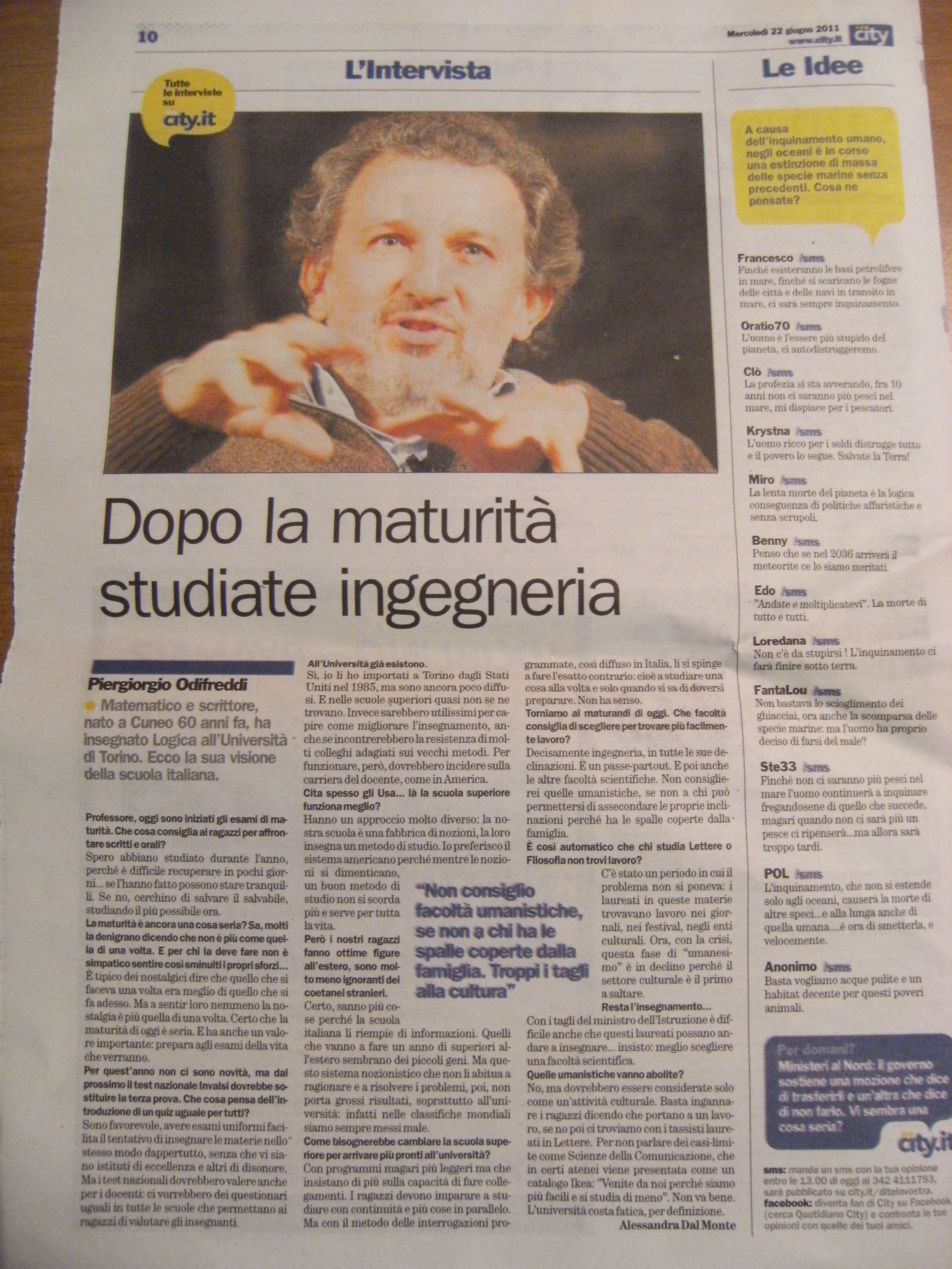 Dopo la maturità studiate ingegneria intervista a Piergiorgio Odifreddi di Alessandra Dal Monte su City Milano del 22 giugno 2011 p. 10