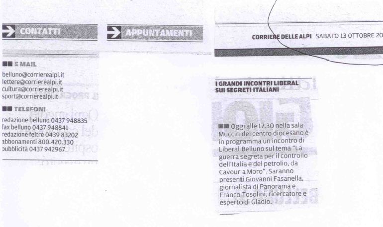 I grandi incontri liberal sui segreti italiani su Corriere delle Alpi del 13 ottobre 2012