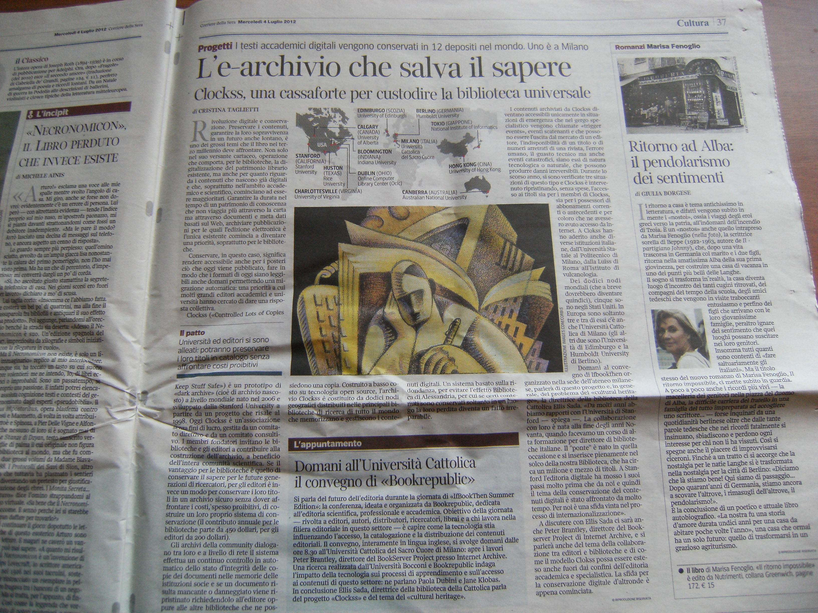 L’e-archivio che salva il sapere di Cristina Taglietti su Corriere della Sera del 4 luglio 2012 p. 37