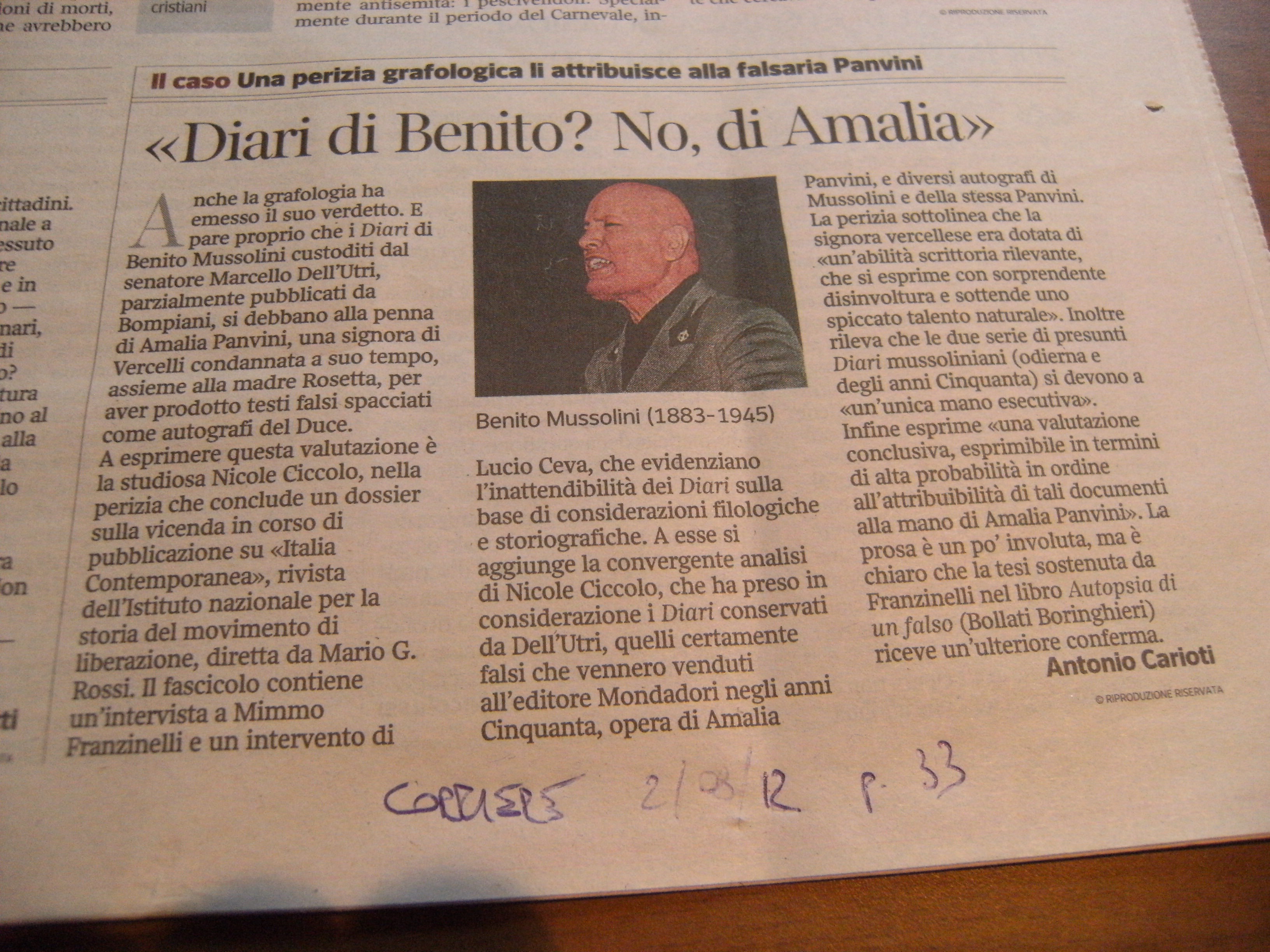 “Diari di Benito? No, di Amalia” di Antonio Carioti su Corriere della Sera del 2 agosto 2012 p. 33