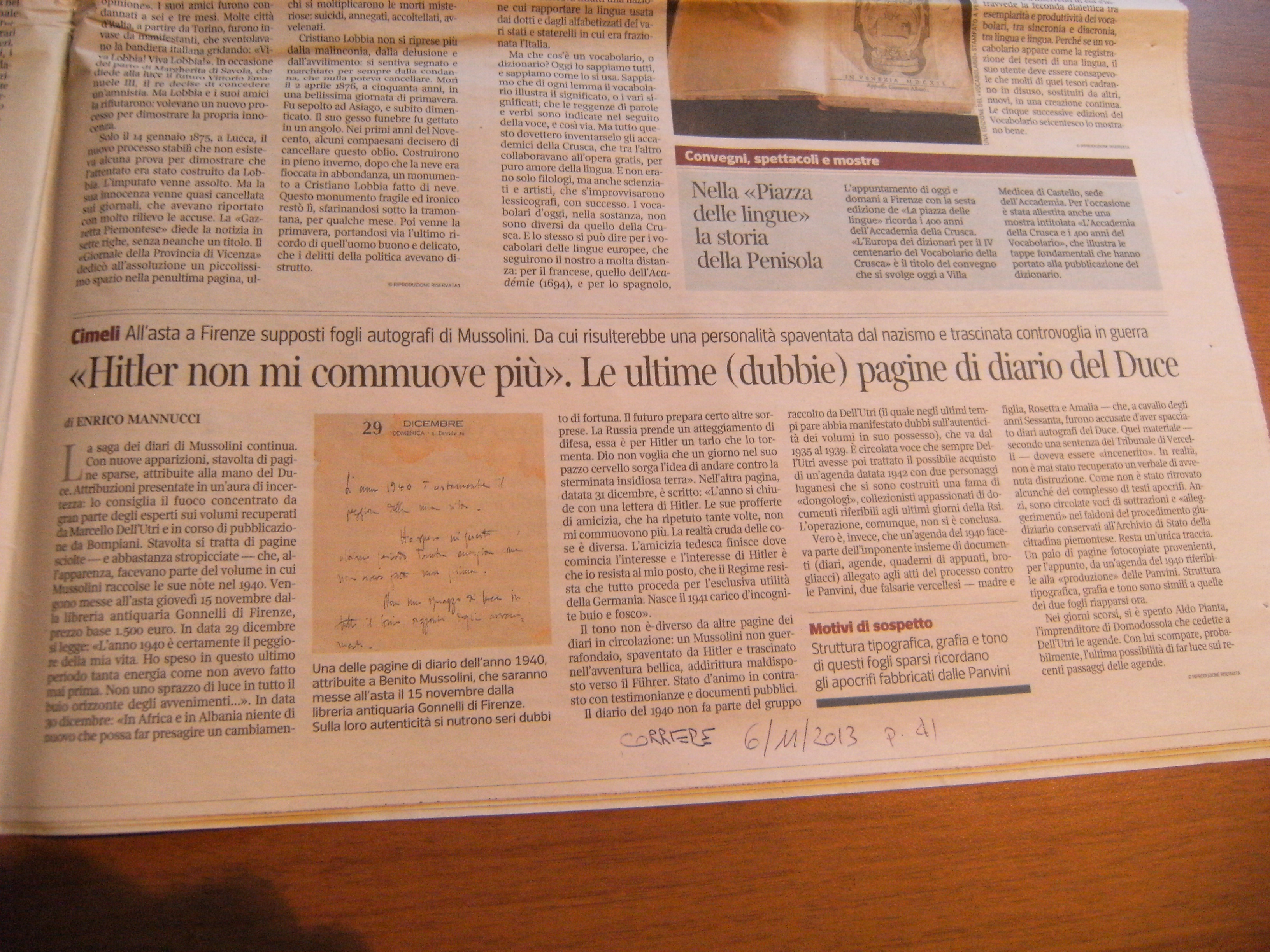 “Hitler non mi commuove più”. Le ultime (dubbie) pagine del diario del Duce di Enrico Mannucci su Corriere della Sera del 6 novembre 2012 p. 41 – Diari di Mussolini