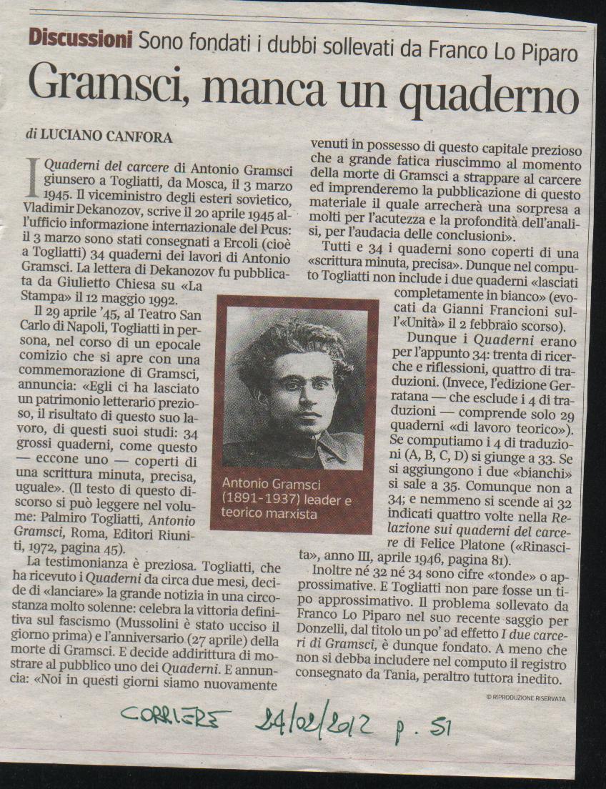 Gramsci, manca un quaderno di Luciano Canfora su Corriere della sera del 24 febbraio 2012 p. 51