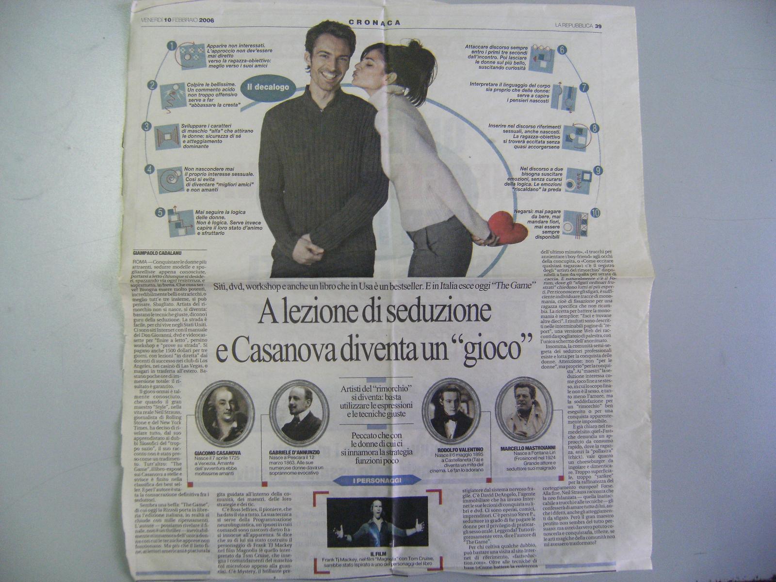 A lezione di seduzione e Casanova diventa un “gioco” di Gianpaolo Cadalanu in La Repubblica del 10 febbraio 2006 p. 39